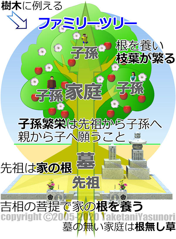 ご先祖様は、この目で直接見ることは出来ないが、私たちの元となる方です。そこで地中にあって目に見えない樹木の「根」に例えます。 先祖・墓は子孫の根であり、その子孫は枝葉です。「根の如く枝葉なる」先祖・墓の如く子孫に、家庭に影響が現れます。